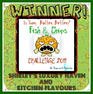 So who's recipe won this challenge? I loved both recipes so much that I couldn't chose just one, so I'm awarding both entries the Badge of Honor!! Congratulations Joy and Shirley, you are the winners of "Is Your Batter Better Fish & Chips Challenge 2011!