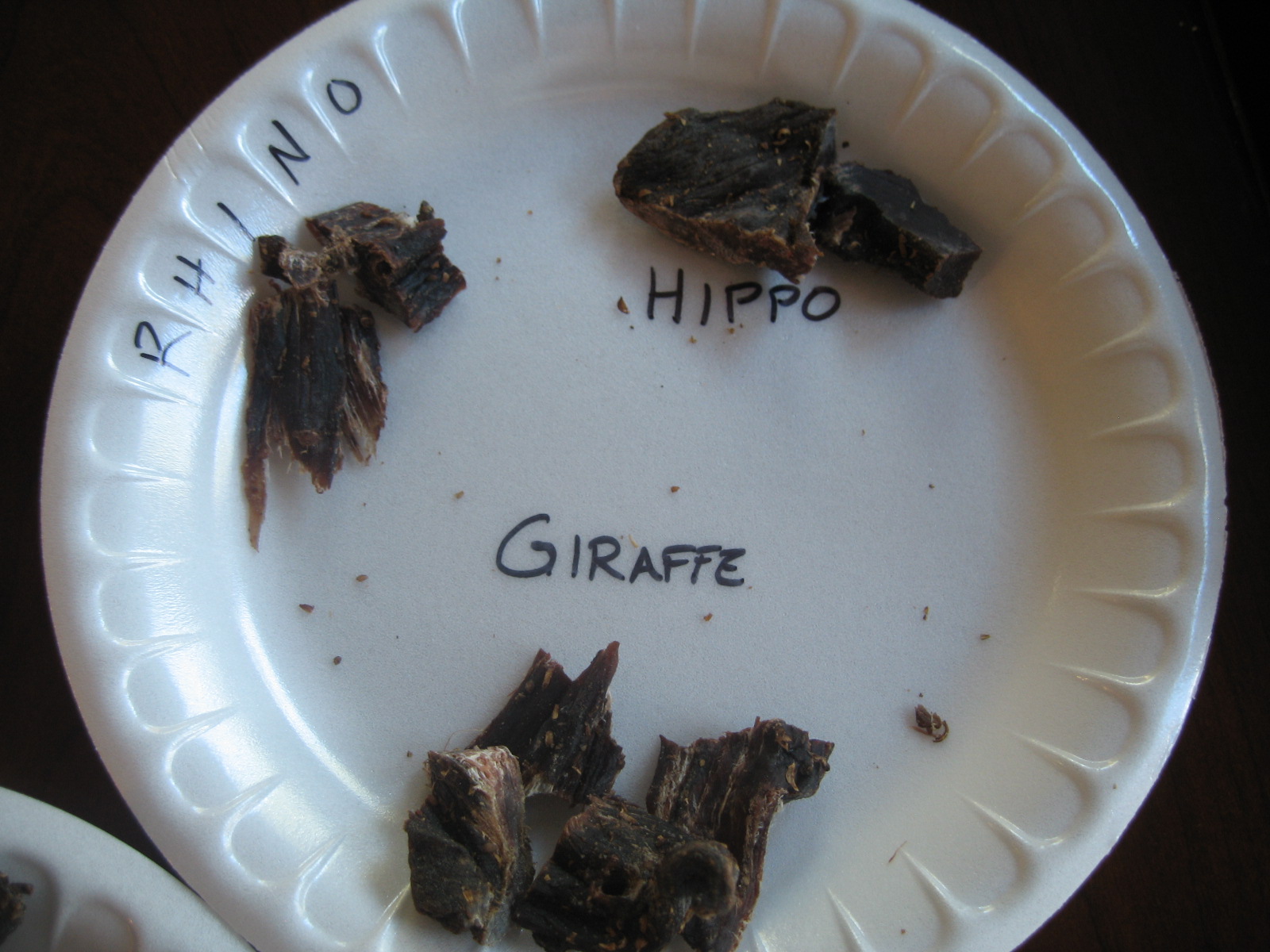 I started first with the Giraffe, then the Roobok, Hippo, and Kudo. They all tasted similar to our American version of beef jerky but the Giraffe was tough and dry. The Kudo, Roobok, and Hippo were moister and the textures were similar to a steak that had been dried in the sun. I didn’t detect any gaminess in any of these varieties.